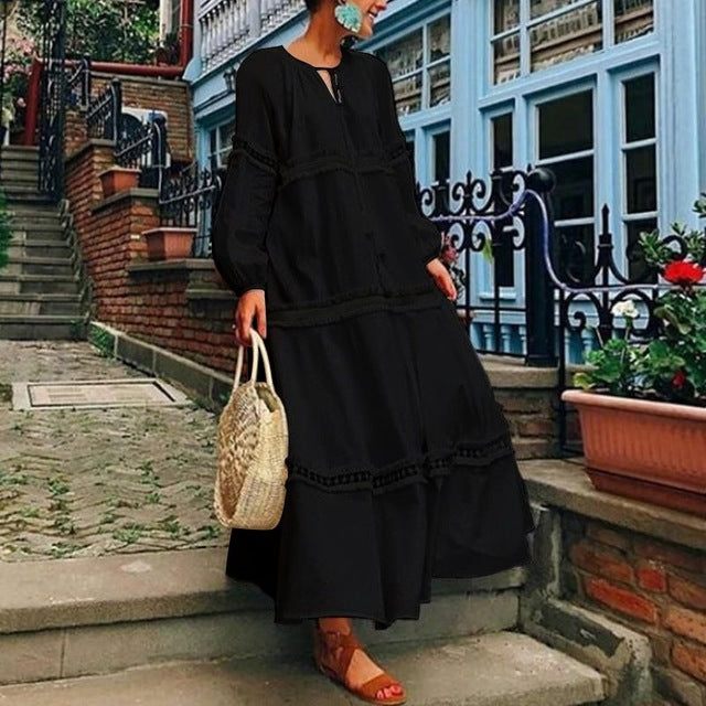 Bohemian Women Maxi Long Dress Lace Autumn Sexy Lantern Sleeve V Neck Hollow Out Party Dresses Casual