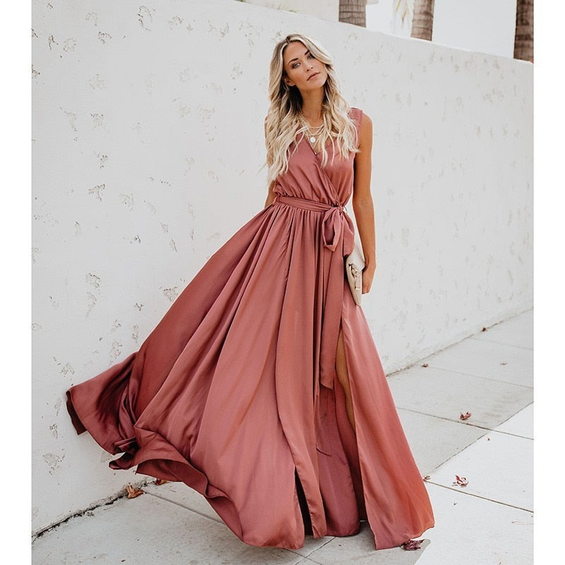 Yellow Boho Beach Dress Summer Belt Split Long Maxi Dress Bohemian Style